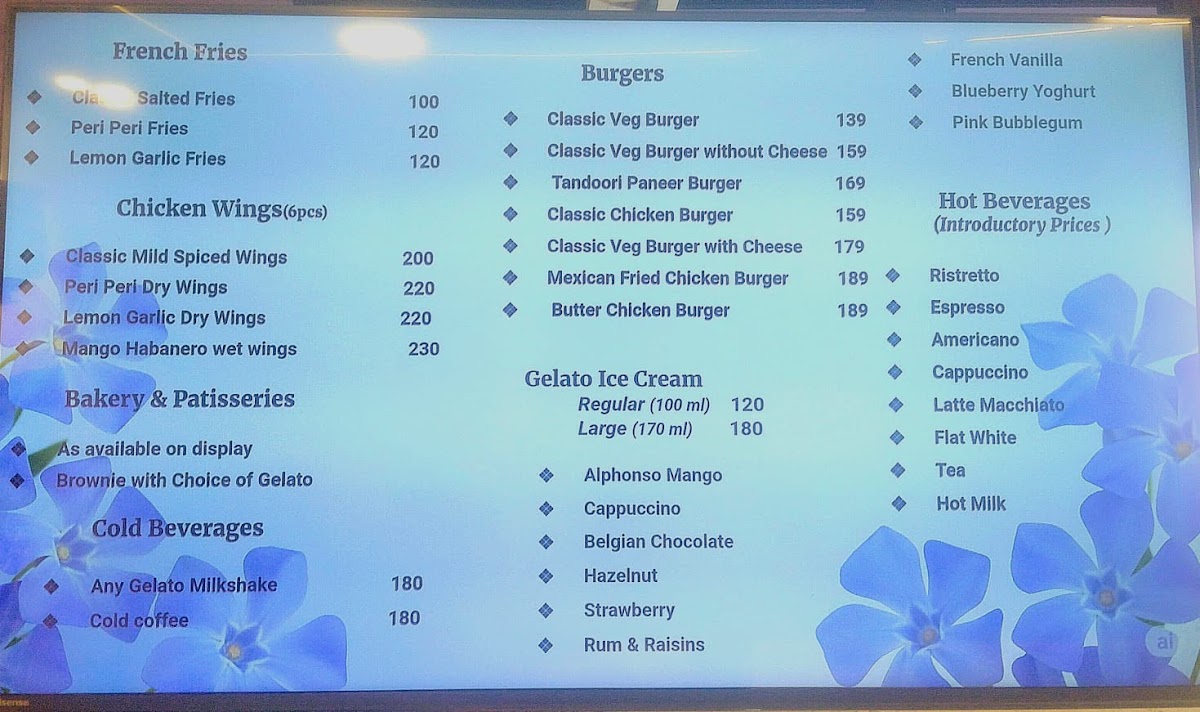 But the experience doesn’t stop there. Quench your thirst with a luscious Gelato Milkshake or rich Cold Coffee, both available for ₹180. These beverages promise to provide a refreshing contrast to the savory delights, ensuring you enjoy a well-rounded experience. Don’t forget to check out their exquisite selection of gelato, featuring flavors like Belgian Chocolate, Hazelnut, Strawberry, and Rum & Raisins, perfect for treating yourself to a sweet escape.